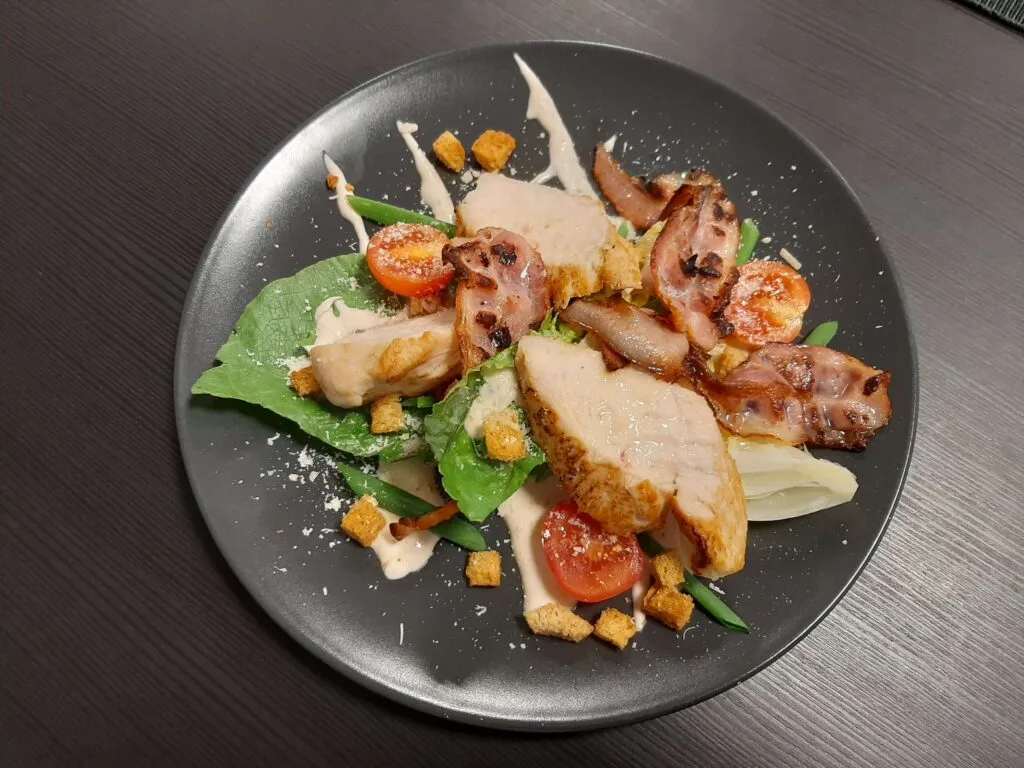 - Sałatka caprese – klasyczne połączenie pomidorów, mozzarelli i bazylii, skropione oliwą z oliwek, podawane na talerzu w formie artystycznej kompozycji.